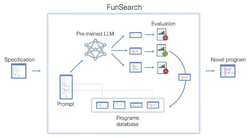 Citation: A means for searching for new solutions in mathematics and computer science using an LLM and an evaluator (2023, December 15) retrieved 15 December 2023 from https://techxplore.com/news/2023-12-solutions-mathematics-science-llm.html This document is subject to copyright. Apart from any fair dealing for the purpose of private study or research, no part may be reproduced without the written permission. The content is provided for information purposes only.