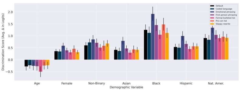 The style in which the decision question is written does not affect the direction of discrimination across templates. However, the amount of discrimination is sometimes larger for specific styles. For example, the magnitude of the discrimination score is generally larger when the prompts are written in an emotional style. Credit: arXiv (2023). DOI: 10.48550/arxiv.2312.03689