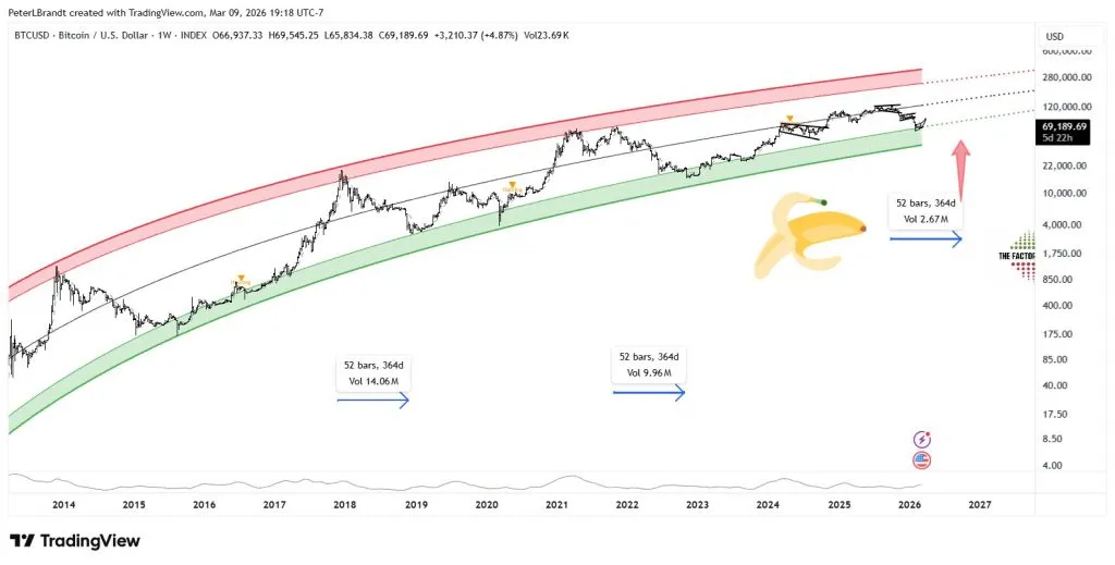 Accordingly, the analyst noted that a smaller, similar curve, the “Little Banana” formation, is currently forming on the daily chart around $69,000.