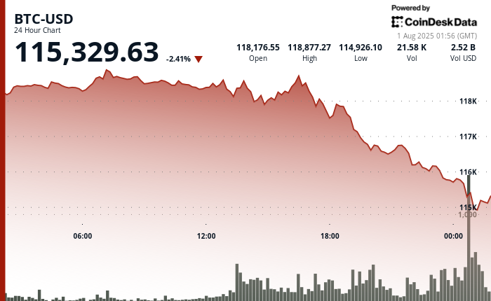 BTC$115,551.54 is trading at $115,500, down 2.3% on the day, as renewed White House tariffs weigh on Asian markets; despite the drop, BTC remains range-bound.
