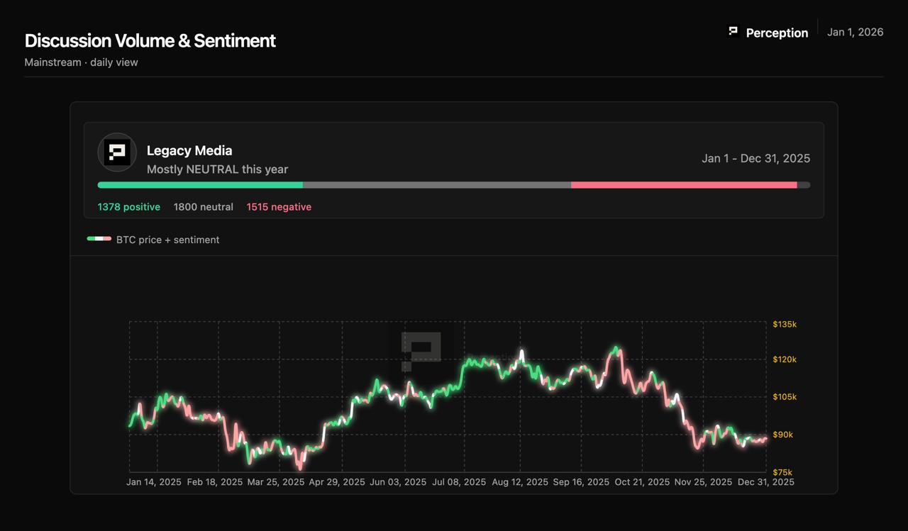 According to an aggregate of sentiment data compiled by crypto intelligence platform Perception, the shift was less about enthusiasm for bitcoin and more about the exhaustion of earlier critiques.