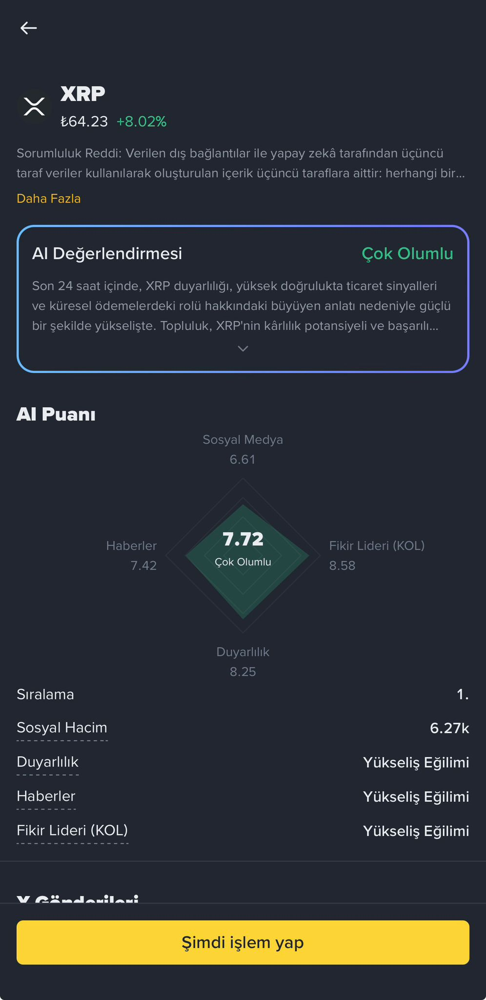 The image below shows an example of how XRP is being evaluated by Binance TR AI at the time of writing this article. The AI system compiles all this data, assigns a score to the cryptocurrency in question, and ranks numerous assets from positive to negative.