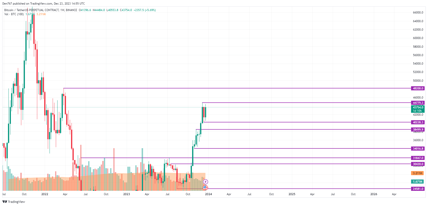 A similar situation is on the weekly chart. If the weekly candle closes above the previous bar peak, the upward move may continue to the $48,200 level.
