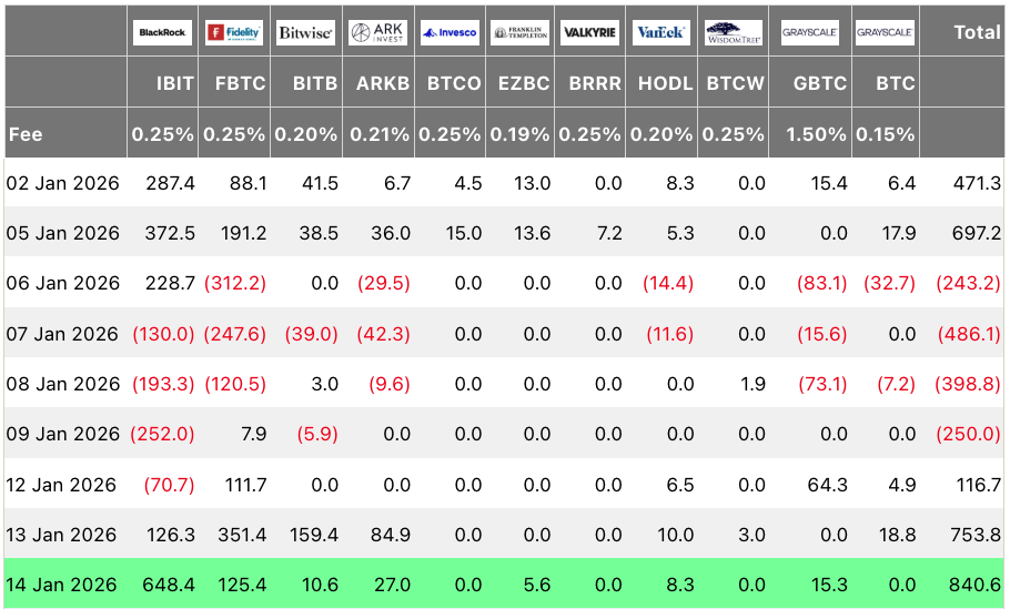 Spot Bitcoin ETF inflows, Jan. 2–14, 2026. Source: Farside