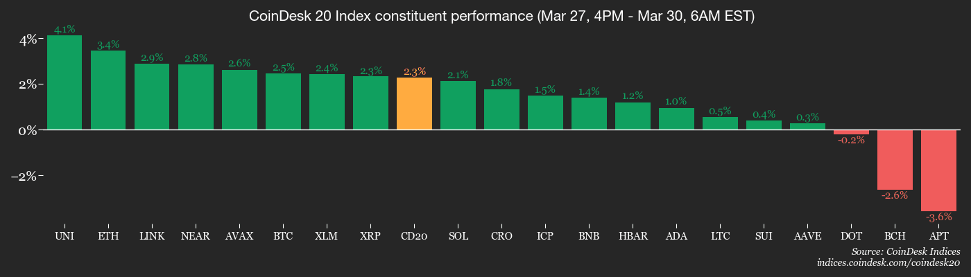 Ether ($ETH) and solana (SOL) prices have risen over 3% since midnight UTC, with $BTC up nearly 2% and XRP lagging at 1.5%. The CoinDesk 20 Index has gained 2% to 1,941 points.