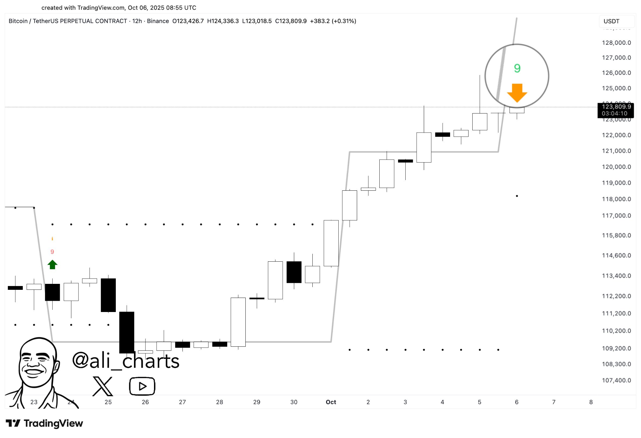 In this line, the TD Sequential indicator has flashed a sell signal on Bitcoin’s 12-hour chart, a pattern that often precedes short-term corrections, according to insights shared by analyst Ali Martinez in an X post on October 6.
