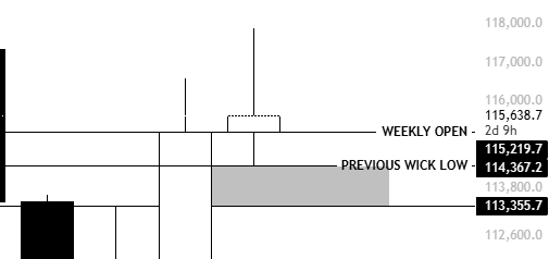 KillaXBT explains that losing the weekly open would likely trigger a price decline to $113,355 because such inefficiencies eventually get filled, as price retraces into the zone to rebalance order flow. However, there is also the presence of the previous wick low at $114,367, which currently sits just above the FVG zone. This intermediate support may act as a buffer before any deeper probe toward the $113,355 mark.