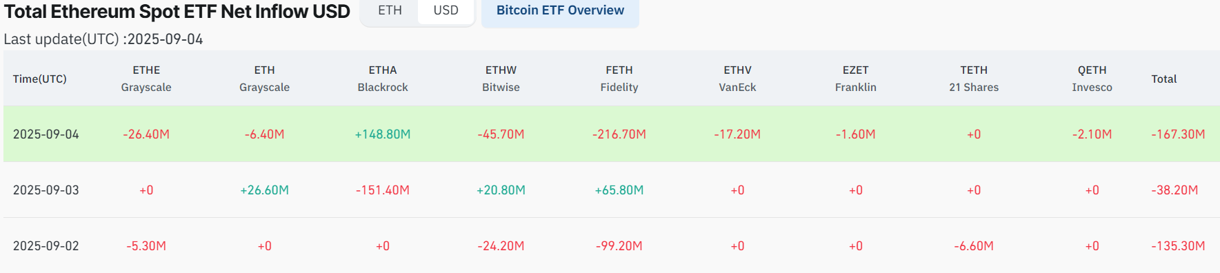 However, the picture was different on September 3, when the market outflow was a more modest $38.2 million. Fidelity attracted $65.8 million and Bitwise added $20.8 million, while BlackRock recorded a $151.4 million outflow.