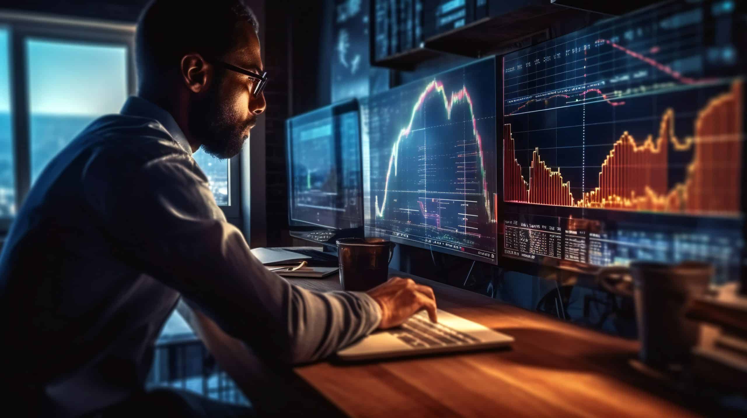 A solitary trader studies stock market graphs on expansive multi monitor workstations, employing mobile app analytics for cryptocurrency and investment growth chart analysis. AI Generative.