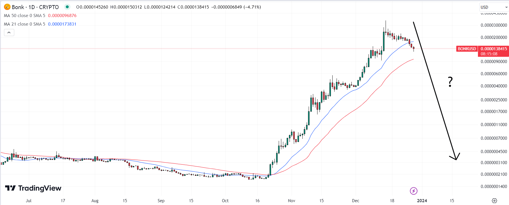 $BONK was last trading just above $0.0000135 and is below its 21DMA for the first time since October as traders take profit following a stellar run higher this quarter.