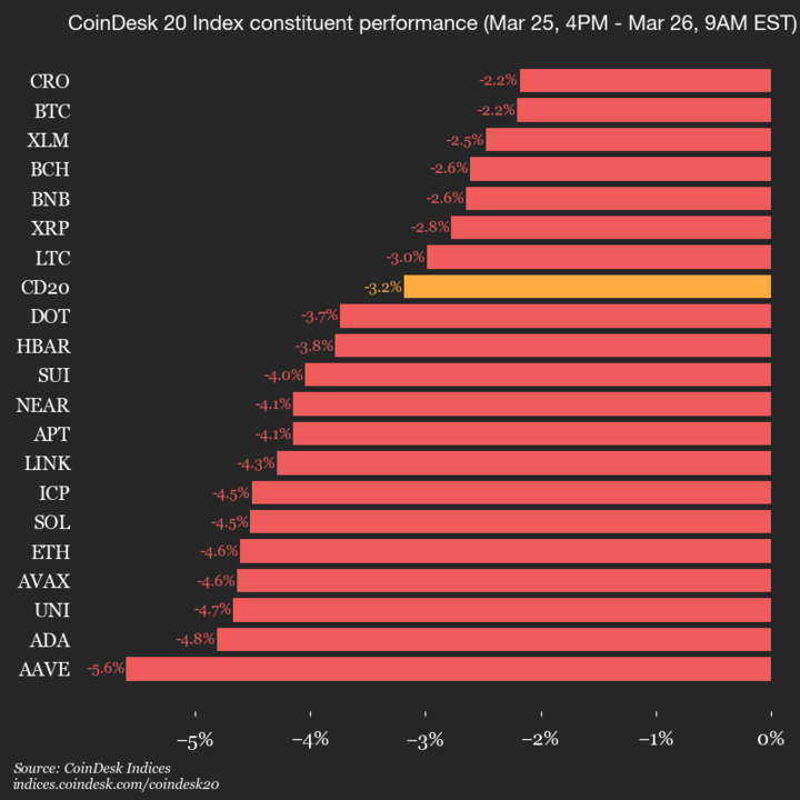 Leaders: CRO (-2.2%) and BTC (-2.2%).