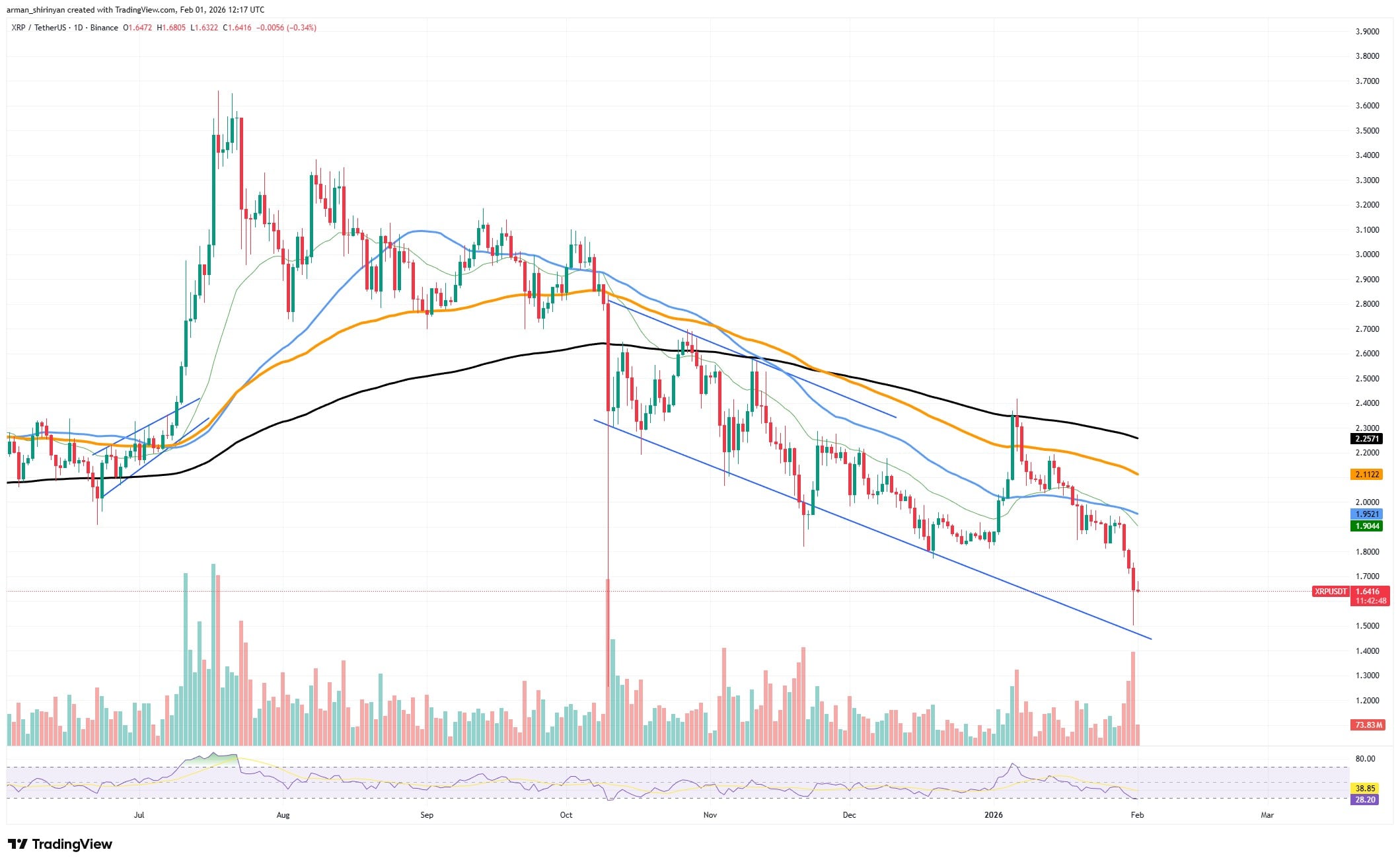 Since surpassing the $3 threshold several months ago, $XRP has been stuck in a steady decline on the daily graph. A classic bearish market structure has been formed as each attempt at recovery has resulted in lower highs and subsequent sell-offs have carved out lower lows. The most recent breakdown forced $XRP through a number of support zones, including trendline support that had been in place during the consolidation in December.