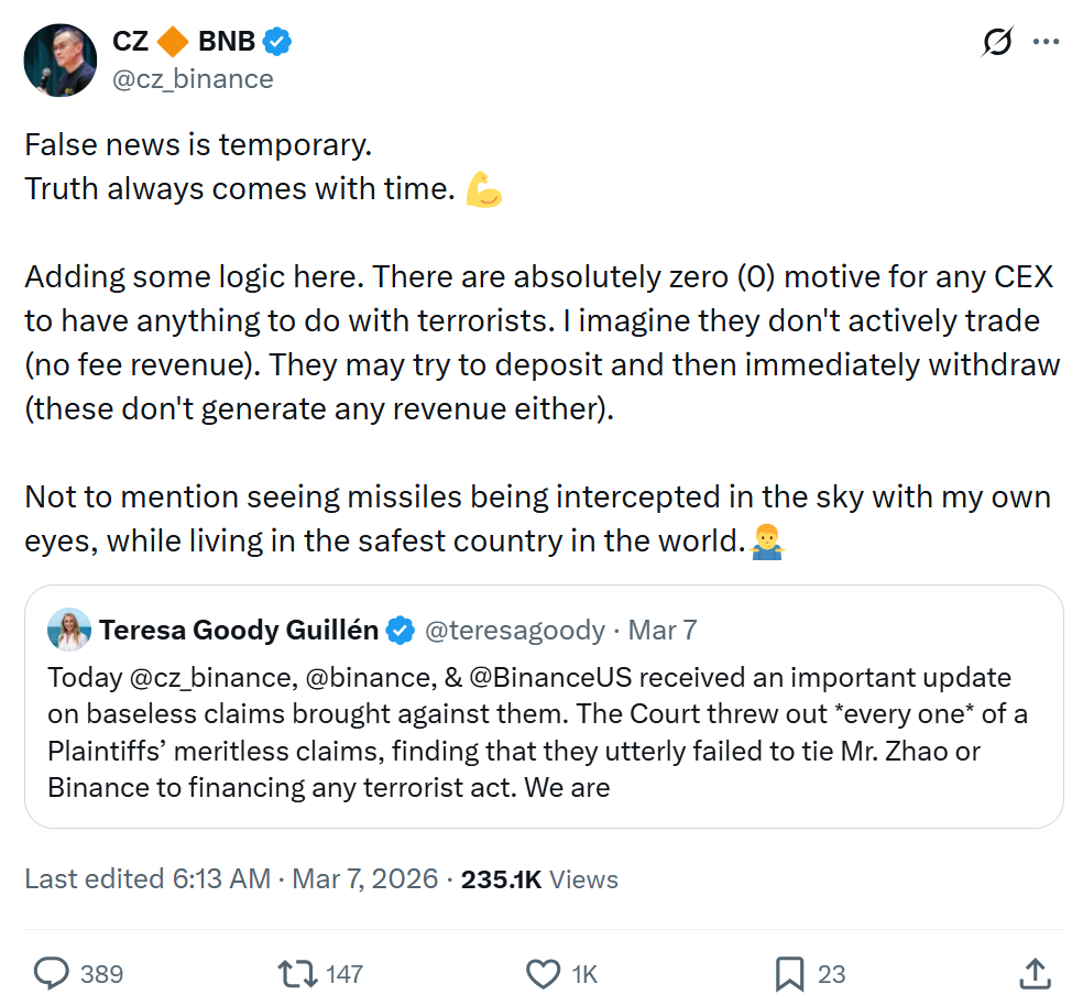 In a post on X, Zhao argued that the economics of crypto trading make such activity illogical for exchanges. “There are absolutely zero (0) motive for any CEX to have anything to do with terrorists,” Zhao wrote, adding that such actors are unlikely to generate trading revenue and may only deposit funds briefly before withdrawing them.
