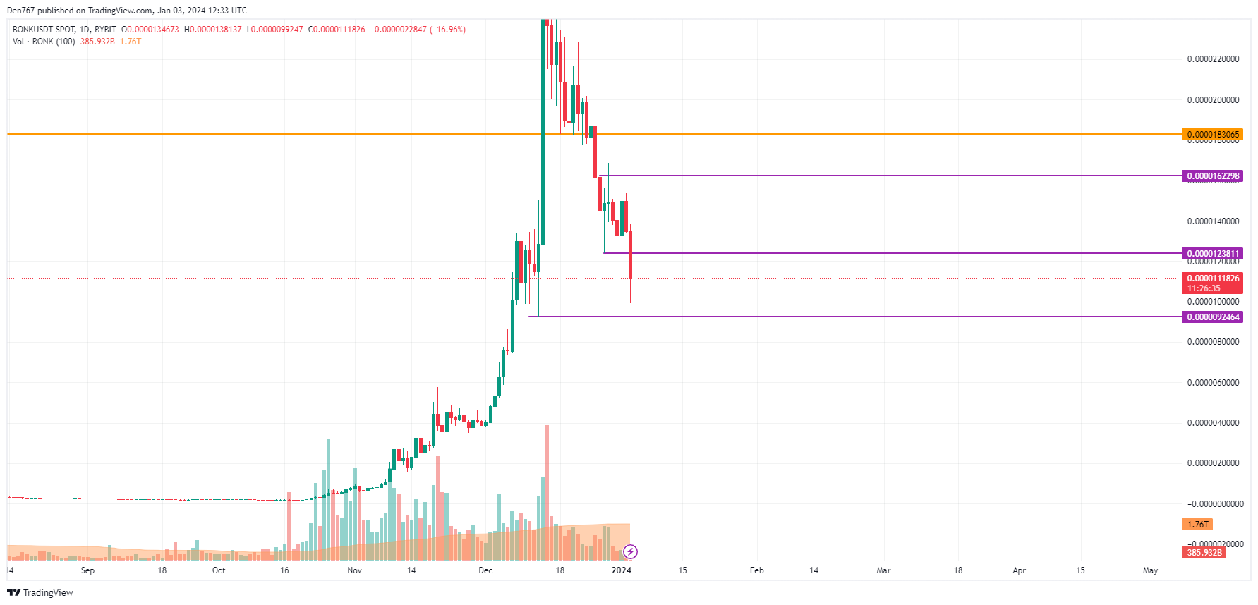 The rate of BONK has broken the support level of $0.00001238, entering the bearish zone. Until the price is below that mark, there are chances to see a further downward move. If that happens, traders may see a test of the $0.0000090 area soon.
