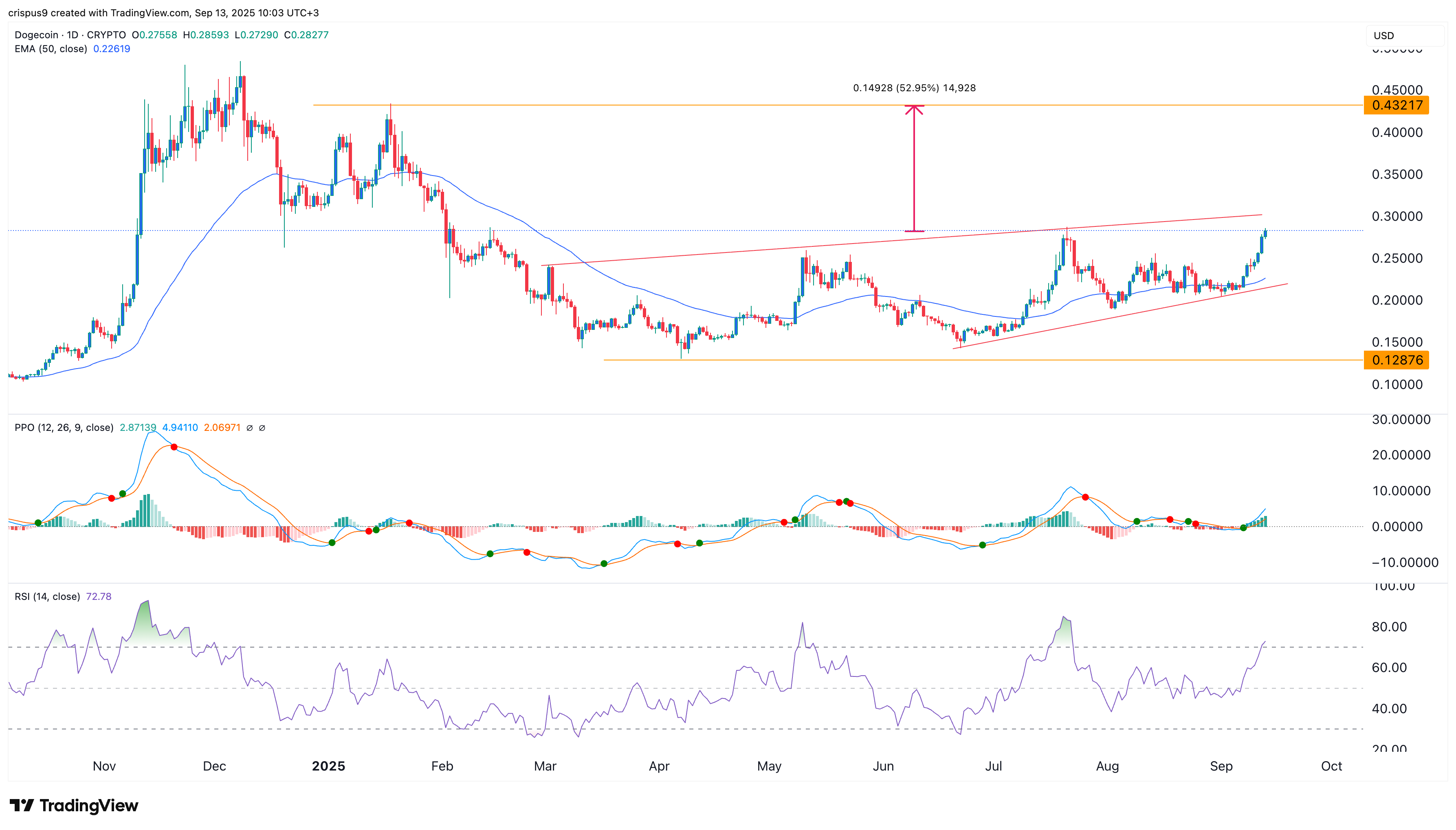 Dogecoin (DOGE) jumped to $0.2840, its highest level since July 21 and 100% above the lowest point in April this year. Its 24-hour volume soared to over $5 billion, a sign of relentless demand.