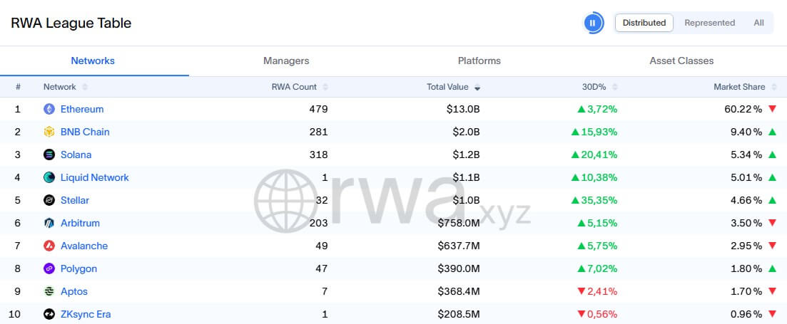 Additionally, data from rwa.xyz shows that Ethereum grew by 3.72% in the tokenized real-world asset (RWA) market over the past 30 days. However, Solana, BNB Chain, and Stellar registered growth of 15.9%, 20.4%, and 35.3%, respectively, in the same period.