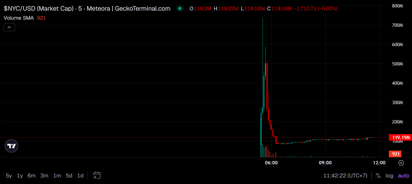 According to GeckoTerminal data, the NYC Token soared to a $730 million valuation but plummeted to $90 million in less than an hour. It has now recovered past $110 million.
