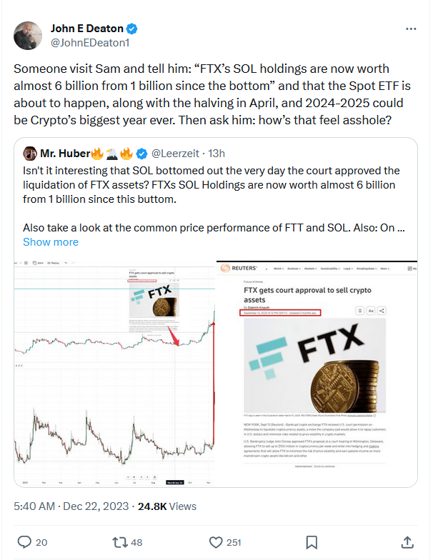 Reaffirming the crypto sleuth “Mr. Huber’s” findings on the impact of SOL’s growth on FTX’s SOL holdings, Deaton stated, “FTX’s SOL holdings are now worth almost 6 billion from 1 billion since the bottom.” The attorney added that major crypto developments, including the much anticipated Bitcoin-ETF launch and the Bitcoin Halving, make 2024-2025 “Crypto’s biggest year ever.”