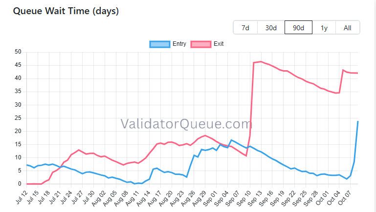 After the initial series of coin deposits, the queue is now up to 23 days for deposits and as much as 41 days for withdrawals. The Grayscale Ethereum Mini Trust made its last deposit of 3.2K ETH a day ago, now still waiting for the contract to process the tokens and accept Grayscale as a validator.