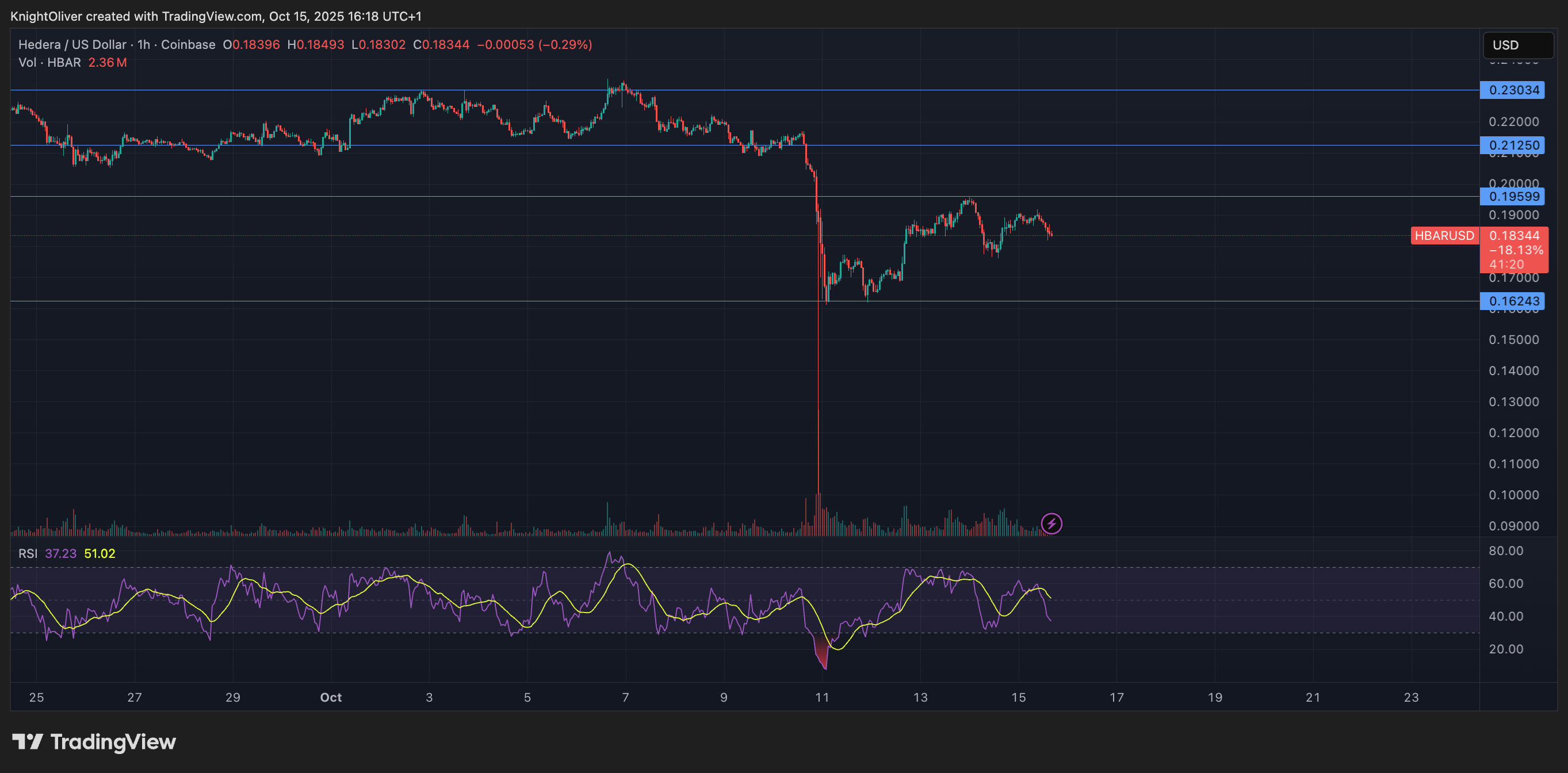Hedera’s HBAR token saw sharp swings between $0.18 and $0.19 over a volatile 23-hour window from Oct. 14 to Oct. 15, with prices moving across a 5% range. The token climbed from $0.18 to a $0.19 peak before hitting resistance, ultimately settling near $0.19 for a modest 2% gain. Support around $0.19 held firm through multiple tests, while selling pressure capped upside momentum.