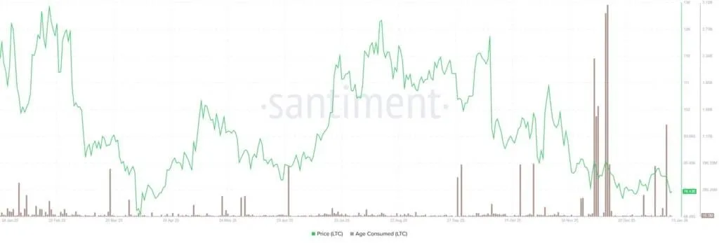 On-chain data from Santiment highlights a notable spike in Litecoin whale activity. The Age Consumed index shows transactions above $100,000 rising to a five-week high of 503 on January 14. This increase aligned closely with Litecoin’s drop toward the $75 region. Large transfers often signal either accumulation or distribution. In this case, the direction remains unclear.