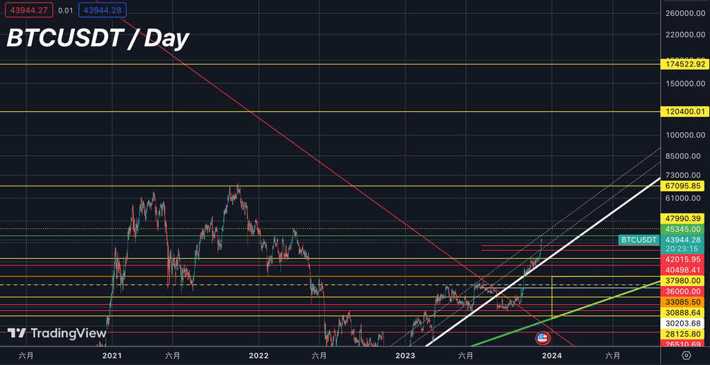 This week, Bitcoin (BTC) continues to stabilize around the $44,000 mark. Short-term trading volume gradually decreases this morning. Short-term targets remain at $45,345 and $47,990. Long-term bullish targets are set at $120,400 and $128,350. High volatility is expected this month, with a potential pullback in Q1 next year.