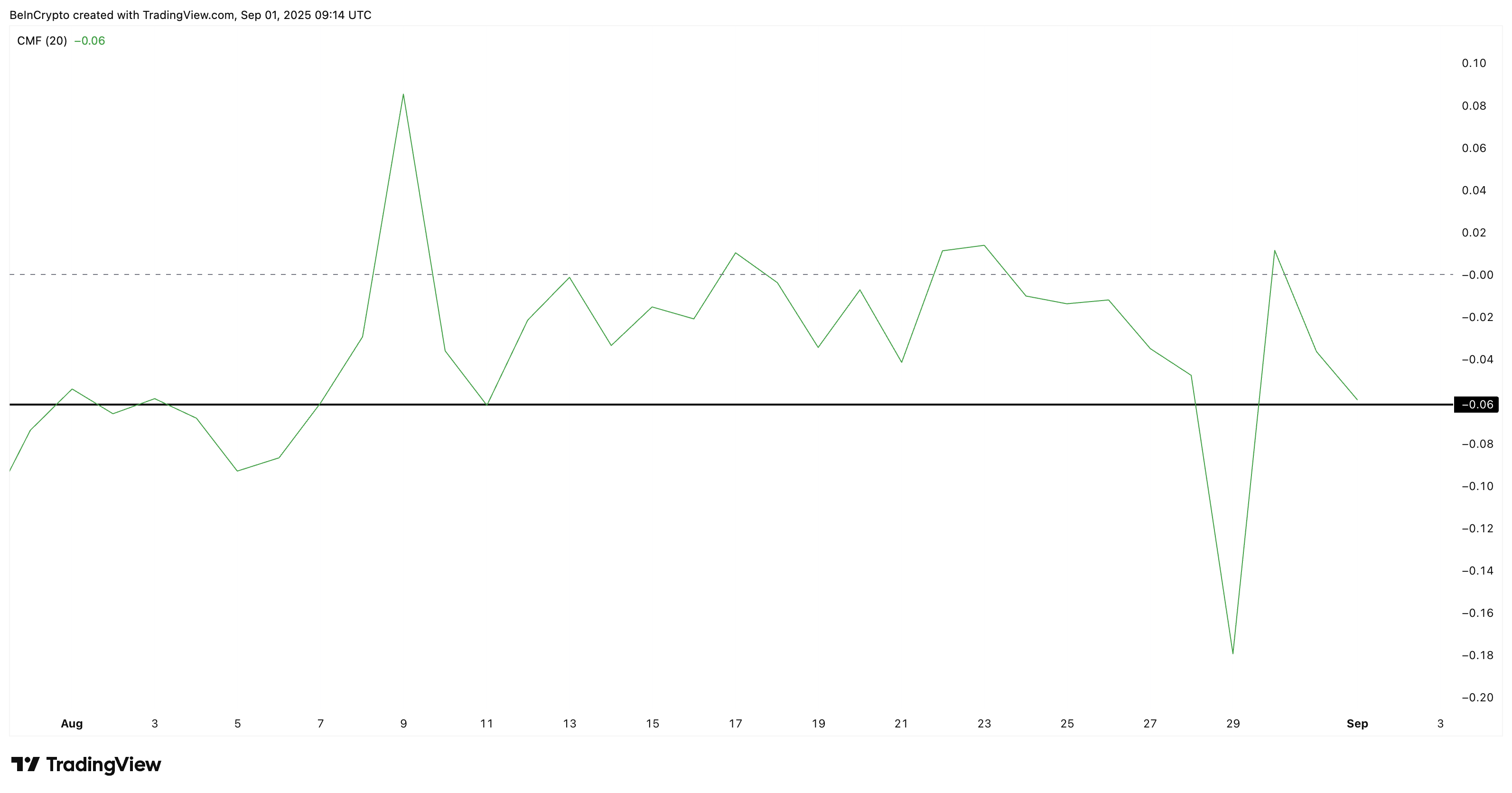 But now it has dropped to -0.06, close to the August 11 low, signaling that capital inflows have dried up and sellers are taking control again.