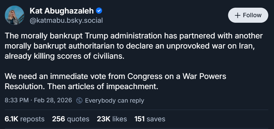 Abughazaleh has not held back. In one post, she wrote that the Trump administration had “partnered with another morally bankrupt authoritarian to declare an unprovoked war on Iran, already killing scores of civilians.”