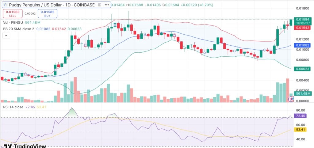 From a technical perspective, PENGU’s breakout has pushed it through resistance levels with rising volume. At 72.89, the relative strength index is high, indicating overbought conditions. PENGU is trading above all of the major moving averages, such as the 20-day SMA at $0.0108 and the 10-day EMA at $0.01294, indicating sustained short-term strength.