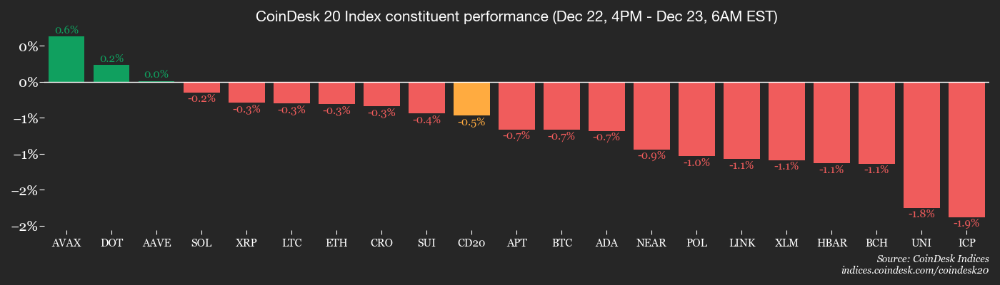Bitcoin BTC$87,785.38, the largest cryptocurrency by market value, fell to $87,500 after failing to hold gains above $90,000 on Monday. All 16 CoinDesk indexes are down over 24 hours, with the DeFi Select index dropping 4% and the metaverse index losing over 3%. HASH and RAIN are the only top-100 tokens by market cap to have gained more than 6% over the past 24 hours.