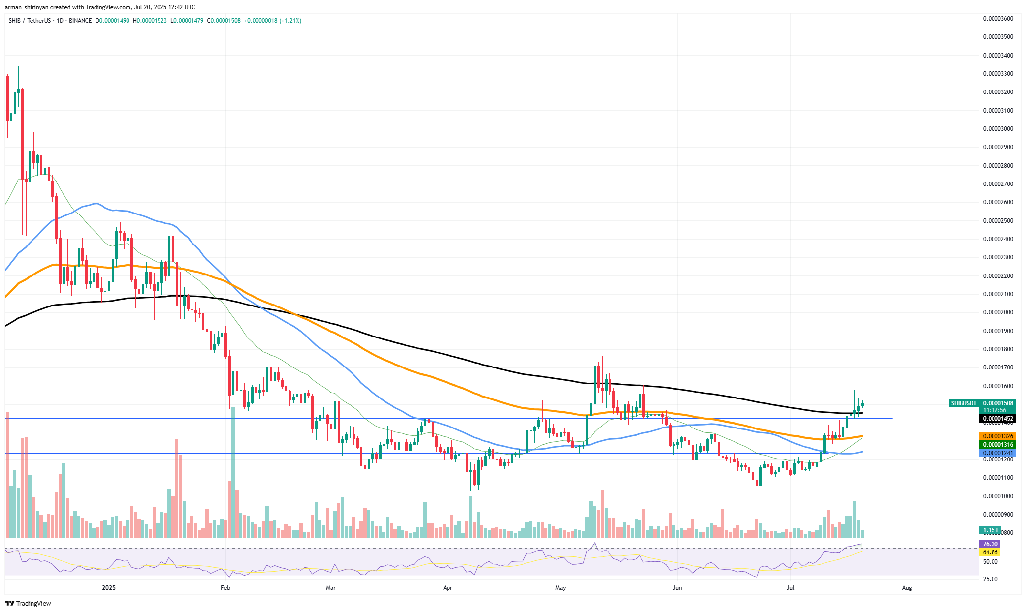 For many years, the 200 EMA has been a trustworthy indicator of whether markets are trending bullish or bearish. With numerous unsuccessful breakouts and sustained consolidation below it, it had served as a ceiling for SHIB since the beginning of 2024. But now that SHIB has decisively broken through the $0.00001450-$0.00001500 zone and is holding above the 200 EMA, a new phase is emerging that might finally work in the bulls' favor.
