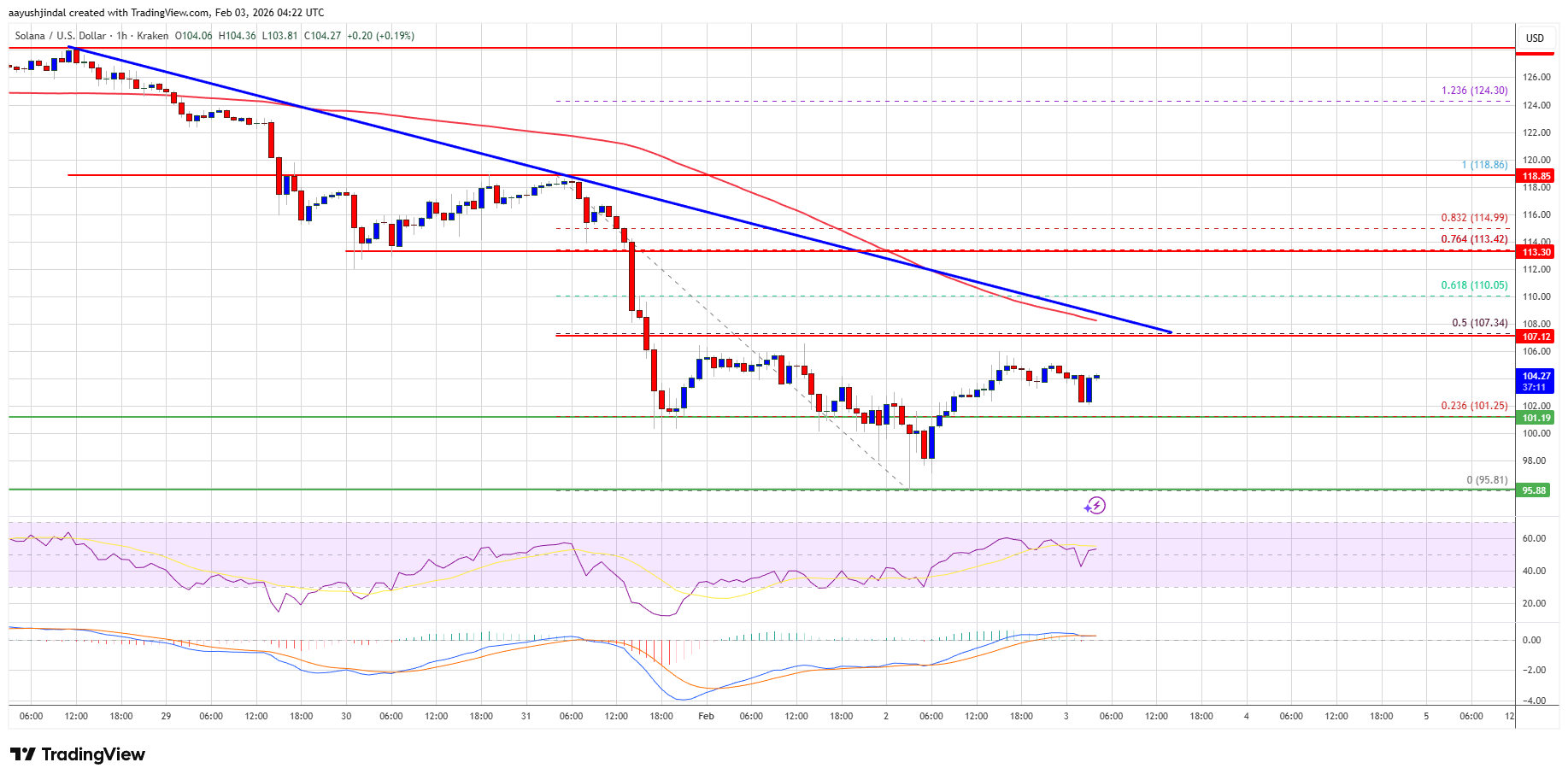 Solana is now trading below $105 and the 100-hourly simple moving average. On the upside, immediate resistance is near the $108 level, the trend line, and the 50% Fib retracement level of the downward move from the $119 swing high to the $95.81 low.