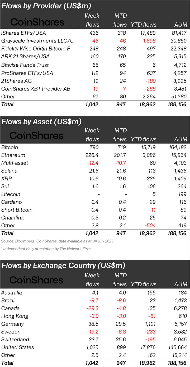 “Last week, $1.03 billion inflows were experienced in cryptocurrency investment products, with asset inflows reaching a record level of $188 billion, marking the 12th consecutive week of inflows.”