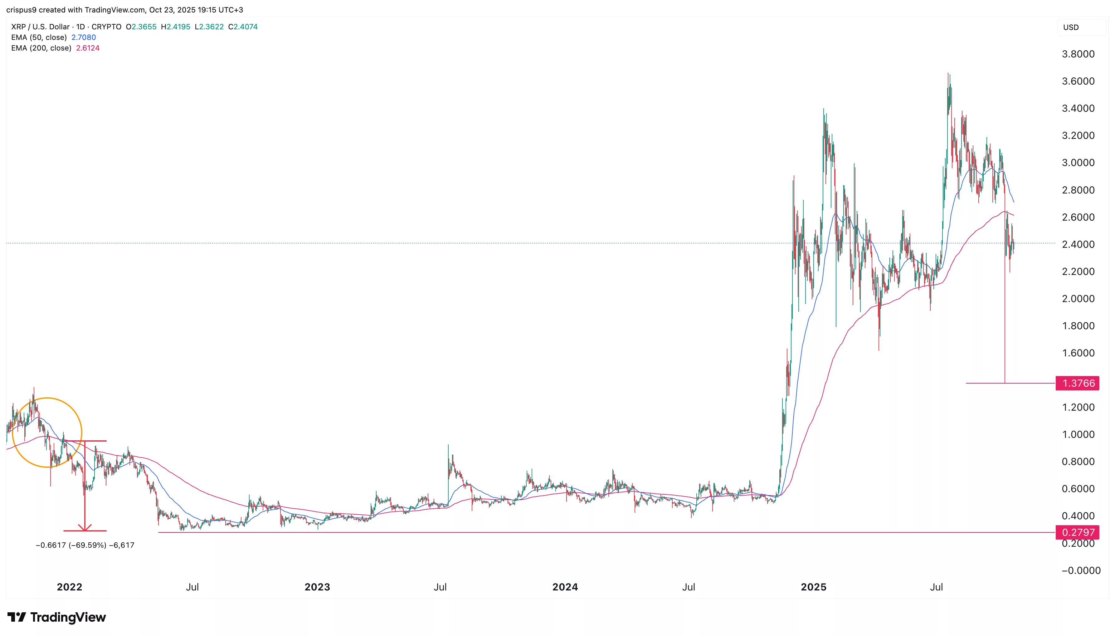 XRP price remains in a deep bear market after plunging by 34% from its highest point this year.