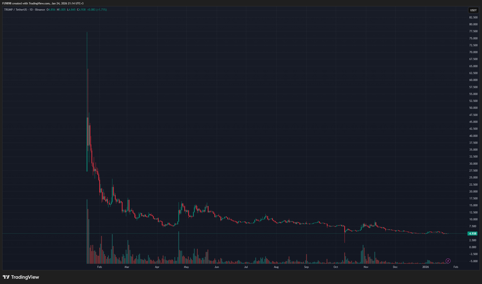 The performance of the TRUMP token, promoted by Donald Trump, after its listing on Binance.