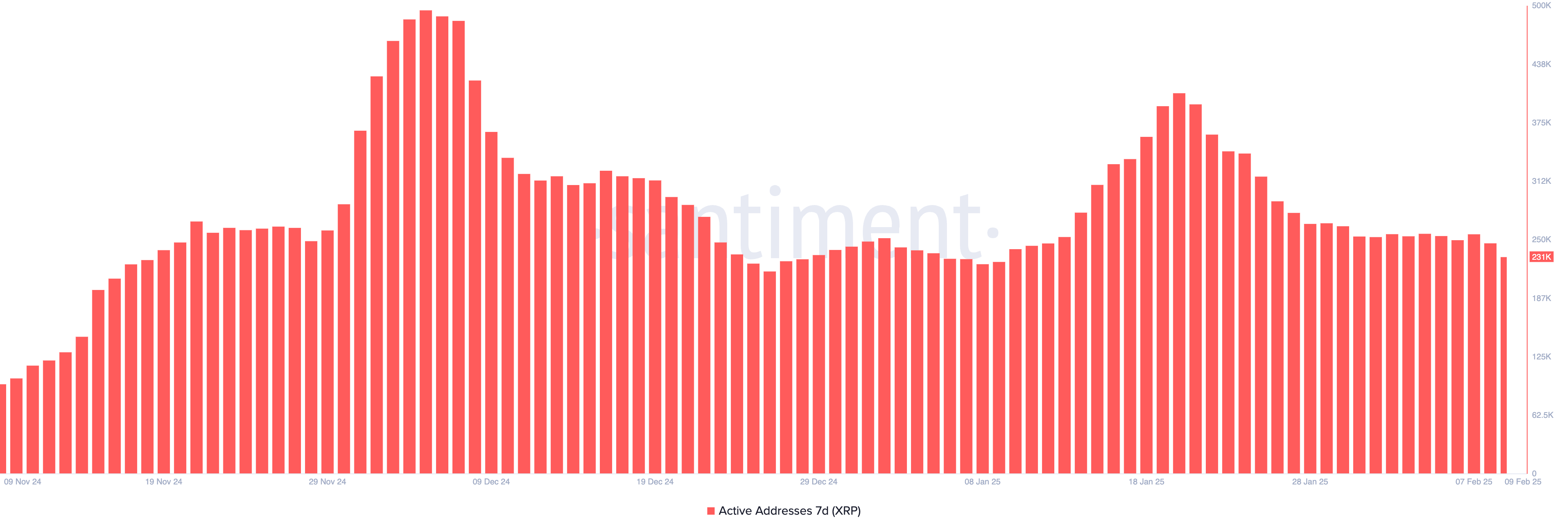 XRP’s 7-day energetic addresses lately peaked at 495,000 on December 5, 2024, earlier than declining. One other surge occurred in mid-January 2025, reaching 407,000 on January 20, however exercise has steadily decreased since then.