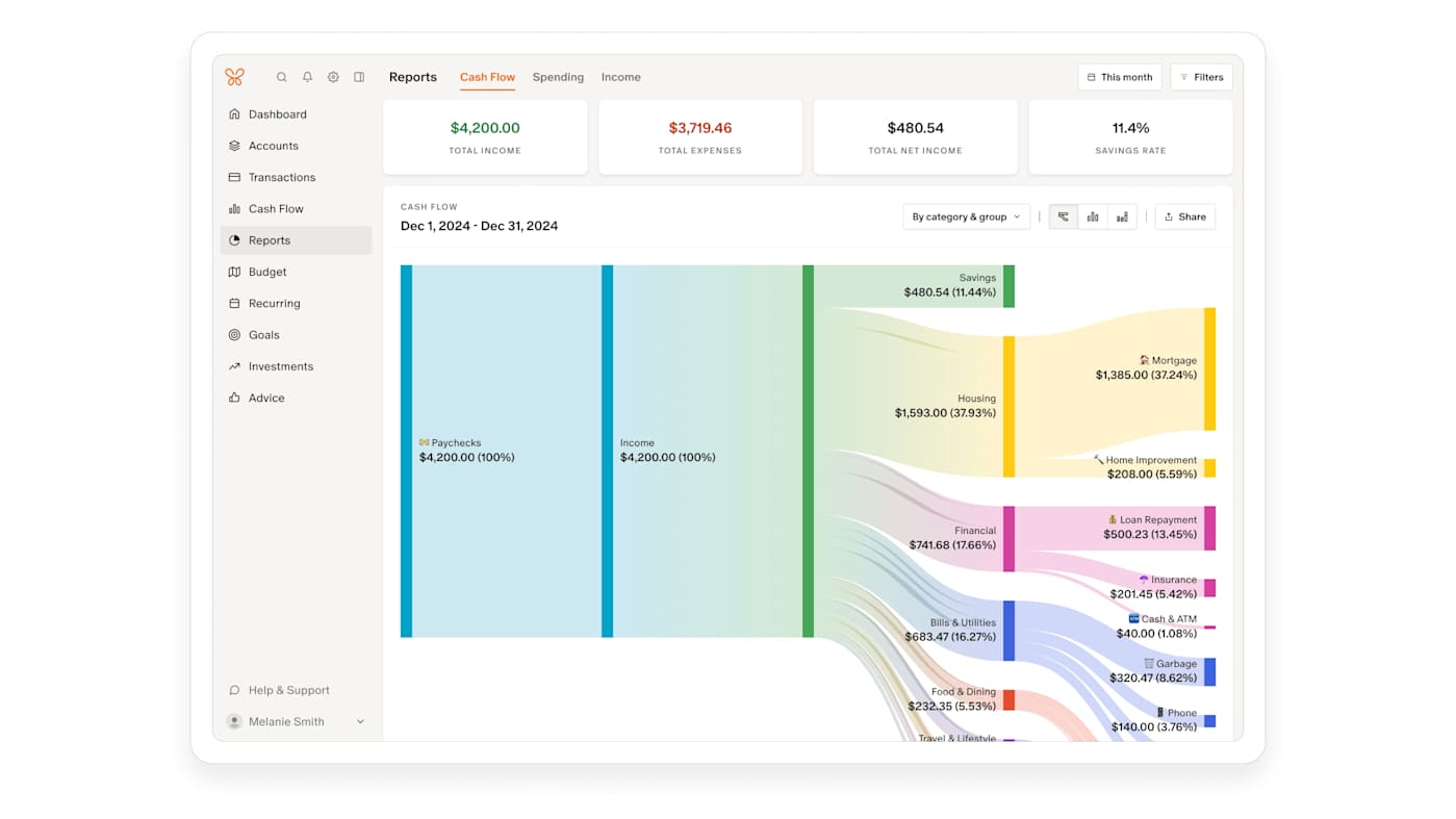 Beyond day-to-day budgeting, Monarch does a good job of showing the bigger picture. It includes visual reports and charts that make it easier to spot trends over time, plus tools for tracking net worth, investments and financial goals. Monarch can even factor in non-cash assets like your home or vehicle, pulling in estimates automatically so they appear alongside your accounts.