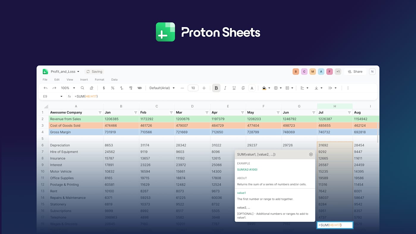 The latest addition to Proton's workplace suite is a spreadsheet tool called Proton Sheets. It will offer real-time collaboration, and users can control who has access to view and edit files. Proton Sheets can also be accessed on any device, including mobile ones. It supports importing CSV and XLS files, and the spreadsheets also support commonly used formulas for calculations.
