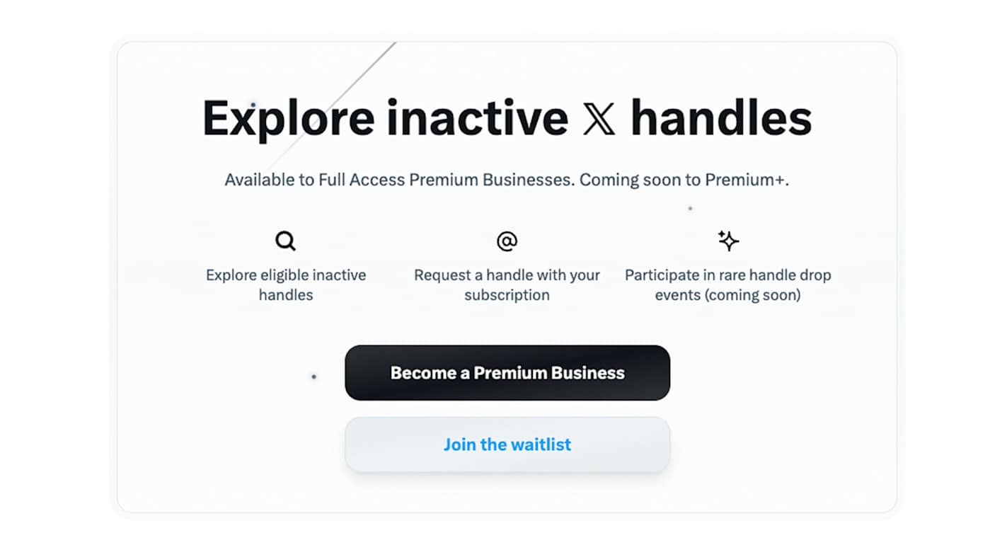 "Some handles are included with a Premium+ or Premium Business subscription," X wrote in an FAQ. "Others – especially Rare handles – may be priced anywhere from $2,500 to over seven figures, depending on demand and uniqueness." People who buy a supposedly rare handle will need to have a Premium+ or Premium Business subscription in order to start the process, but won't be required to maintain one in order to keep the handle.